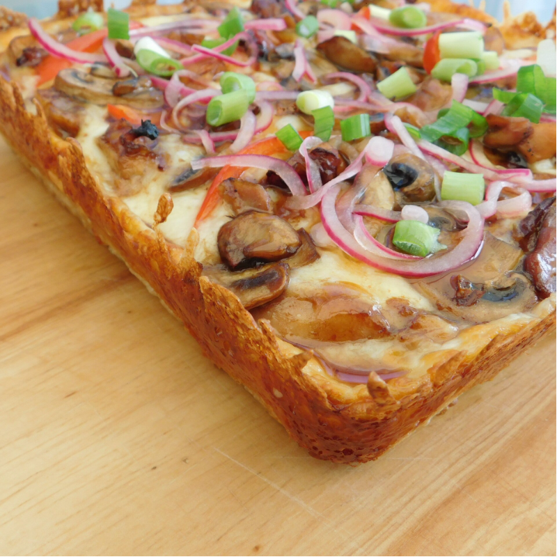The Gua Bao Cruise - A Chinese inspired pizza featuring mild cheddar, tender hoisin chicken, sliced bell peppers, and hoisin glazed mushrooms, complemented by pink pickled onions and finished with a honey hoisin drizzle and a sprinkle of chopped spring onions.