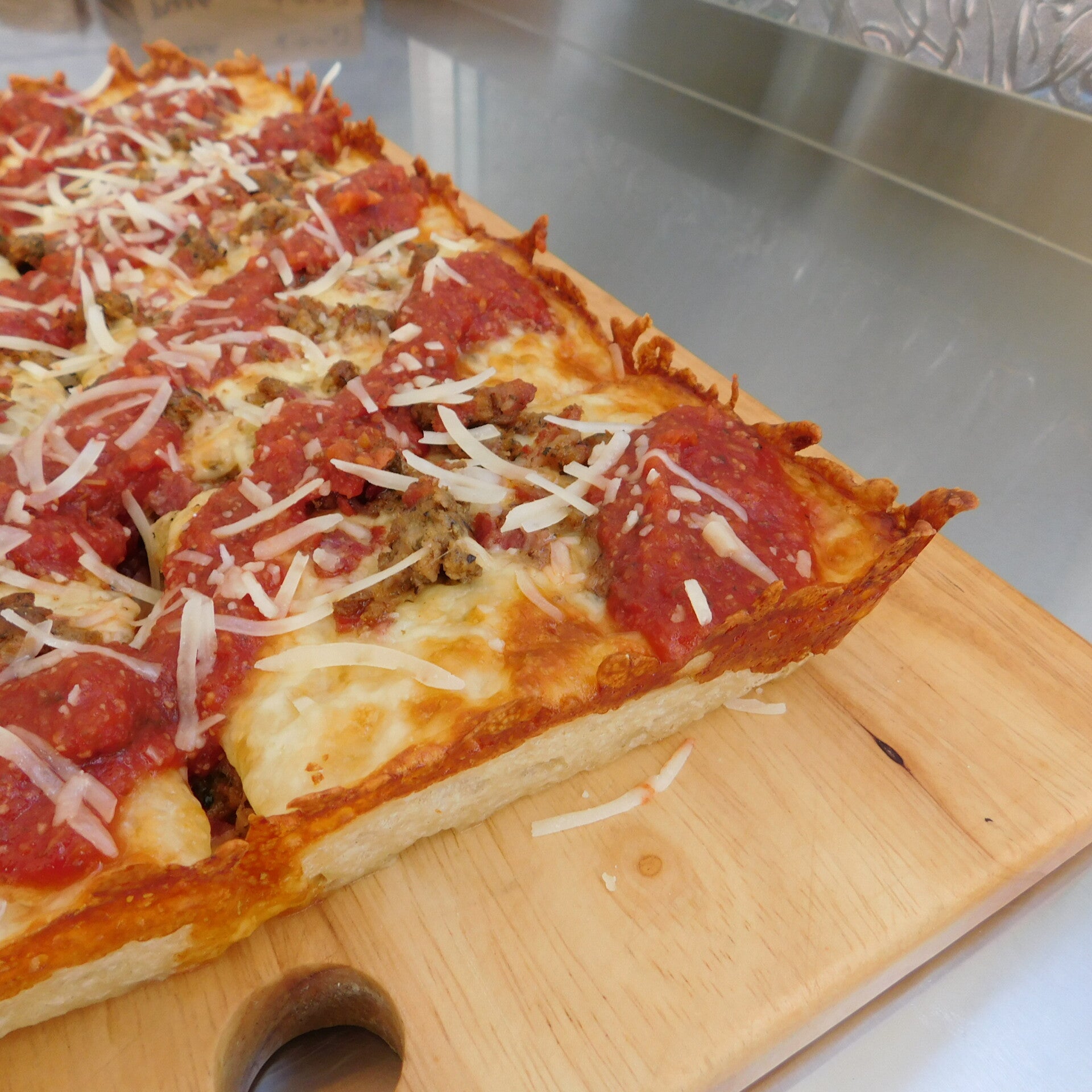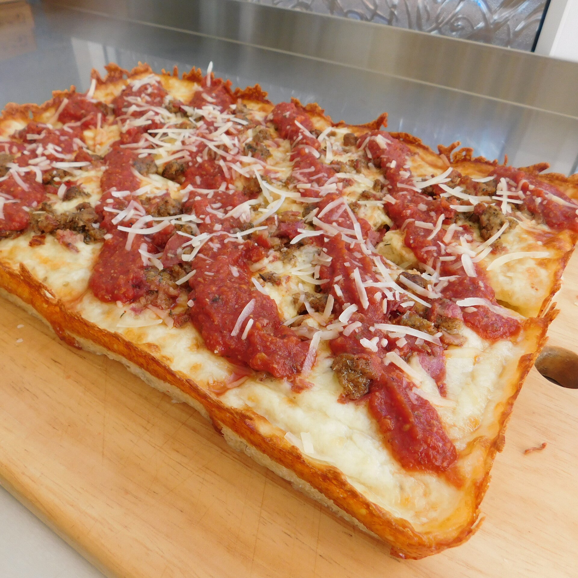 iL Testa Rossa - A meat-feast style pizza with homemade Italian sausage, sliced Milano salami and pepperoni, topped with our rich tomato sauce and finished with freshly grated Grana Padano.