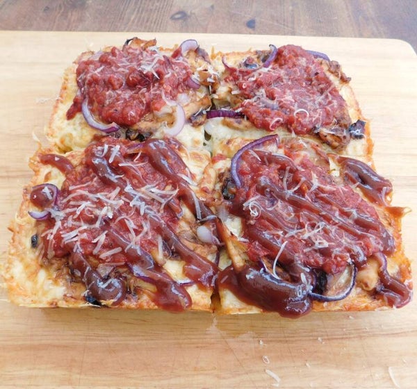 The Pitstop - Topped with shredded marinated chicken coated in BBQ sauce, Red onions, our homemade rich tomato sauce, finished with a drizzle of BBQ sauce.