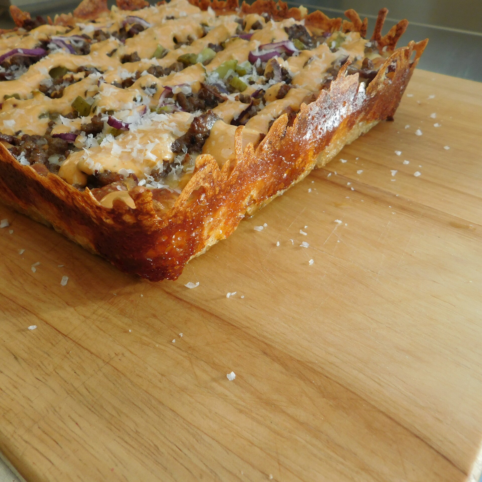 A cheese burger flavoured pizza layered with cheddar cheese, tender beef mince, sliced onions and chopped gherkins, finished with burger sauce and grated Grana Padano.